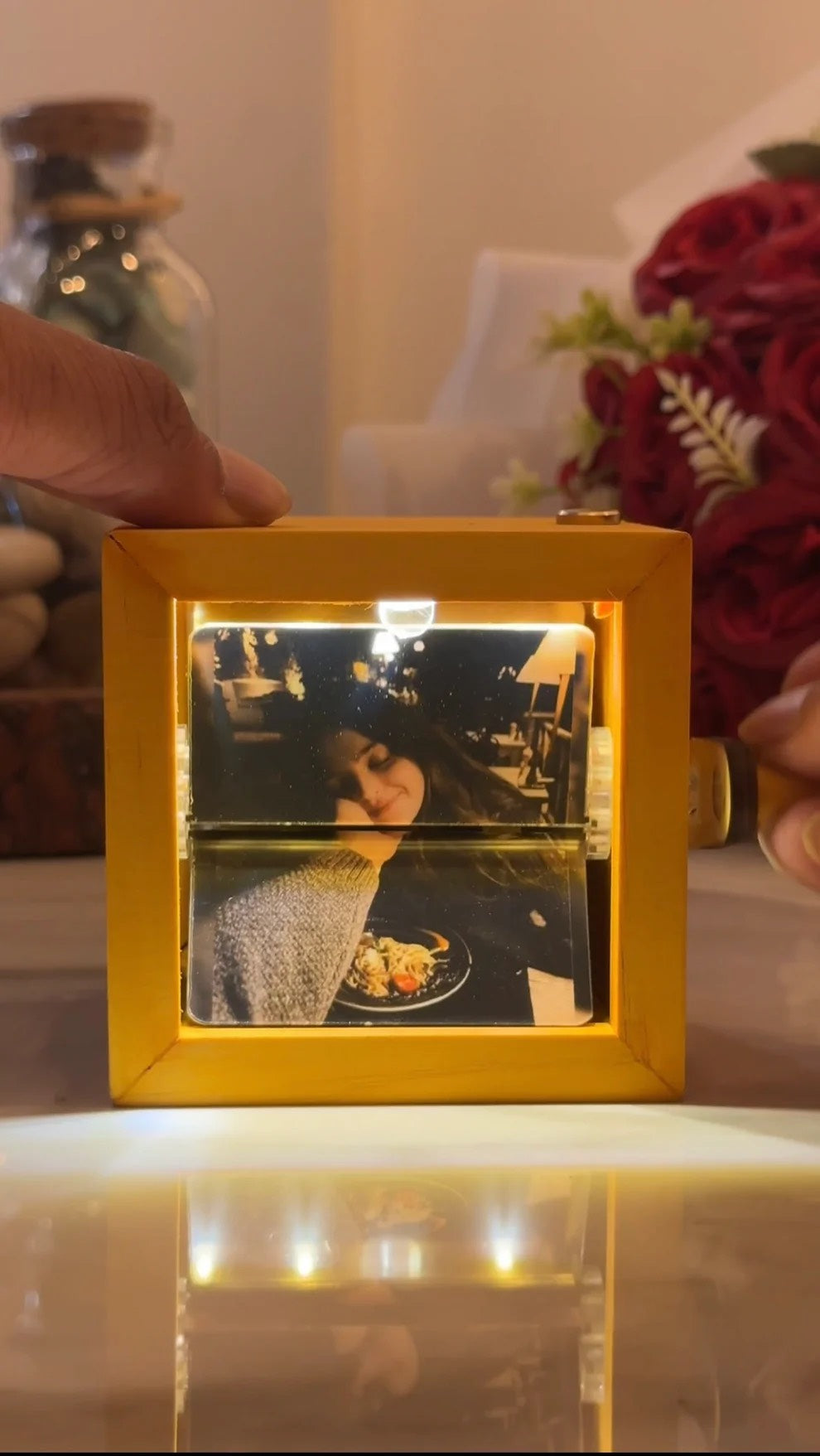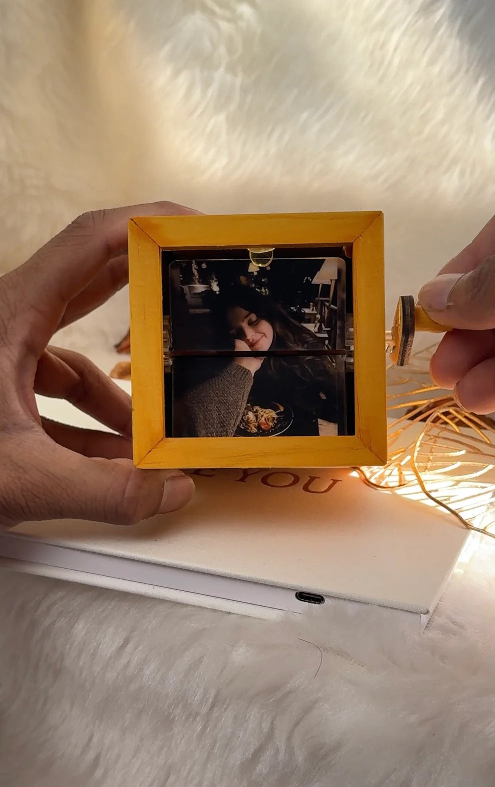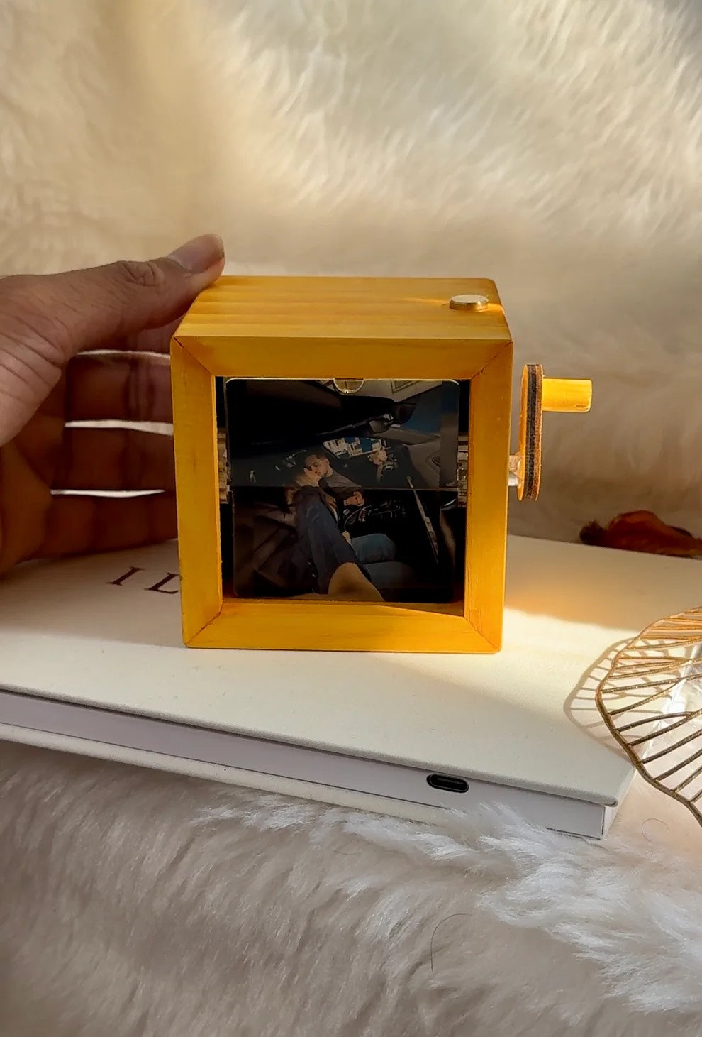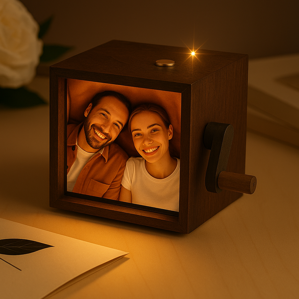 Oui ! Chaque boîte à souvenirs arrive prête à l’emploi : lumière LED intégrée, manivelle en bois et vos photos personnalisées déjà imprimées.